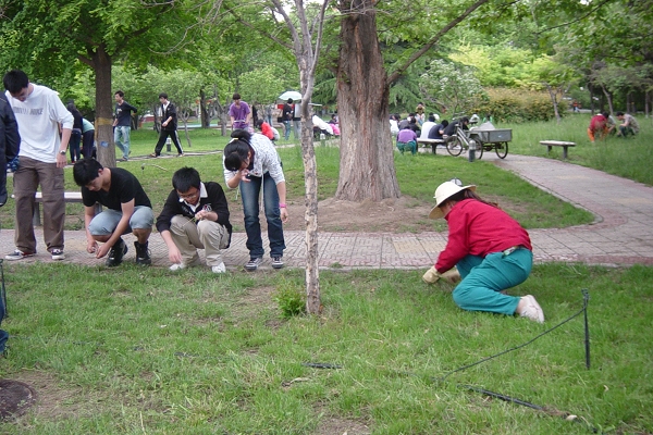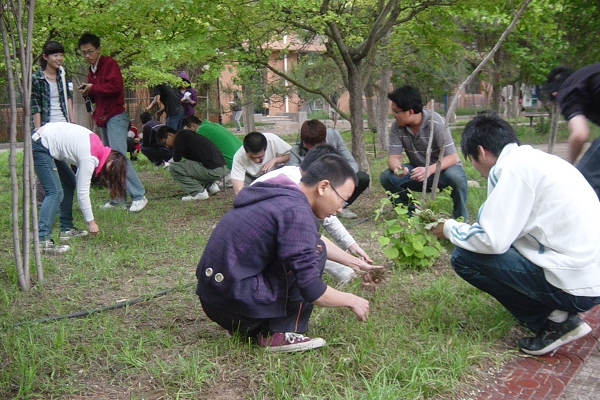 北校区物业服务部全体党员职工、出版传播与管理学院分团委和学生会学生干部共20多人及承担校区物业工作的北京金地名苑物业管理有限公司的工人师傅是北校区活动的主体。活动以清除杂草、捡石头、垃圾、树枝和平树坑等美化校园环境为主要任务。大家拿着小铲子、小锹、小锄头、大竹耙、垃圾袋……纷纷投入到各自的分工区域内开始忙碌起来。在集中清除了草坪和树木周围影响美观的砖石瓦砾、垃圾杂草过程中,师生员工有的人满头大汗、衣服湿了、脏了、有的人手被树枝划破皮了,有的人带病坚持劳动,有的人累弯了腰坐在地上时手也没有歇过……