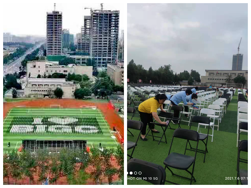 6日一早不到7点,操场上、校园的每条道路上,都是辛勤的后勤员工们忙碌的身影,每一条道路都被打扫干净,大伙儿精心擦拭每张座椅,确保同学们能坐得安心,坐得舒适,几百把座椅被迅速擦拭干净并摆放整齐,天公作美,典礼准时在8点开始,后勤员工们都松了一口气,也倍感欣慰。