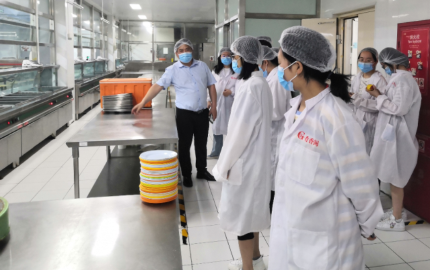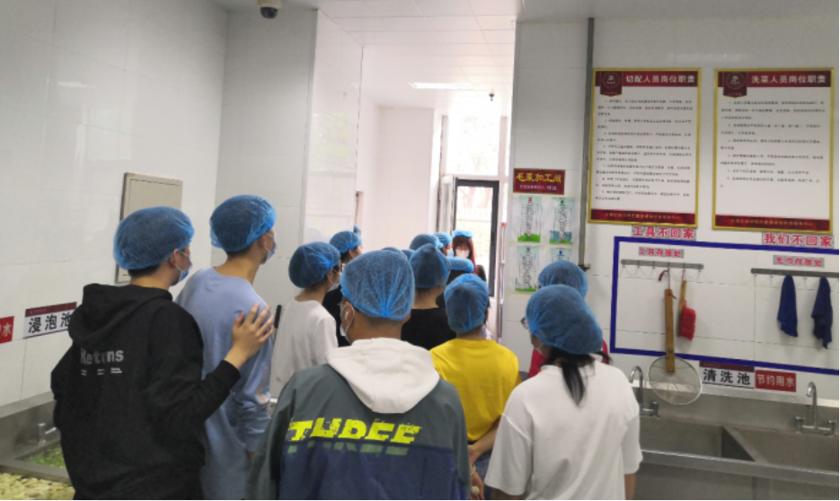 活动前,首先组织同学们进食堂后厨,了解日常用餐的出餐流程。使同学们对食堂的日常工作有了更加直观的感受,同学们饶有兴趣地走遍食堂后厨的各个房间,与食品加工、餐具消毒等实际操作流程进行了零距离接触。通过参观后厨不仅让学生对在校期间食品卫生安全有了更新的认识,同时也加强了学生与食堂之间的相互了解和理解。